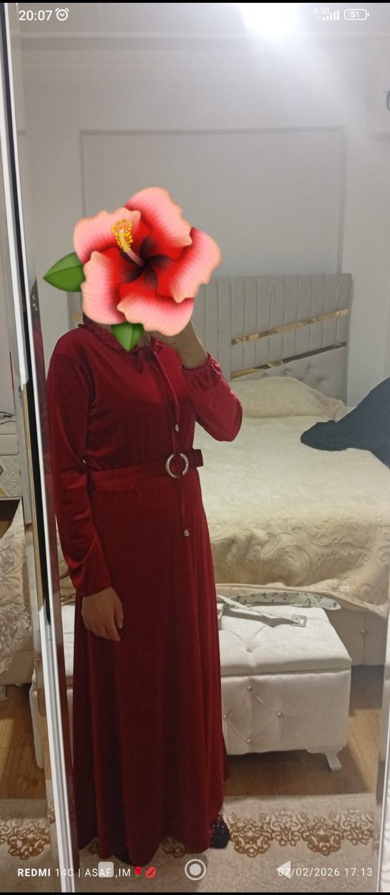 Kırmızı uzun kadife kumaştan, bol kesim, yüksek yakalı ve askılı kollu. Belde kemerli, drapeli tasarım, ofis için uygun.