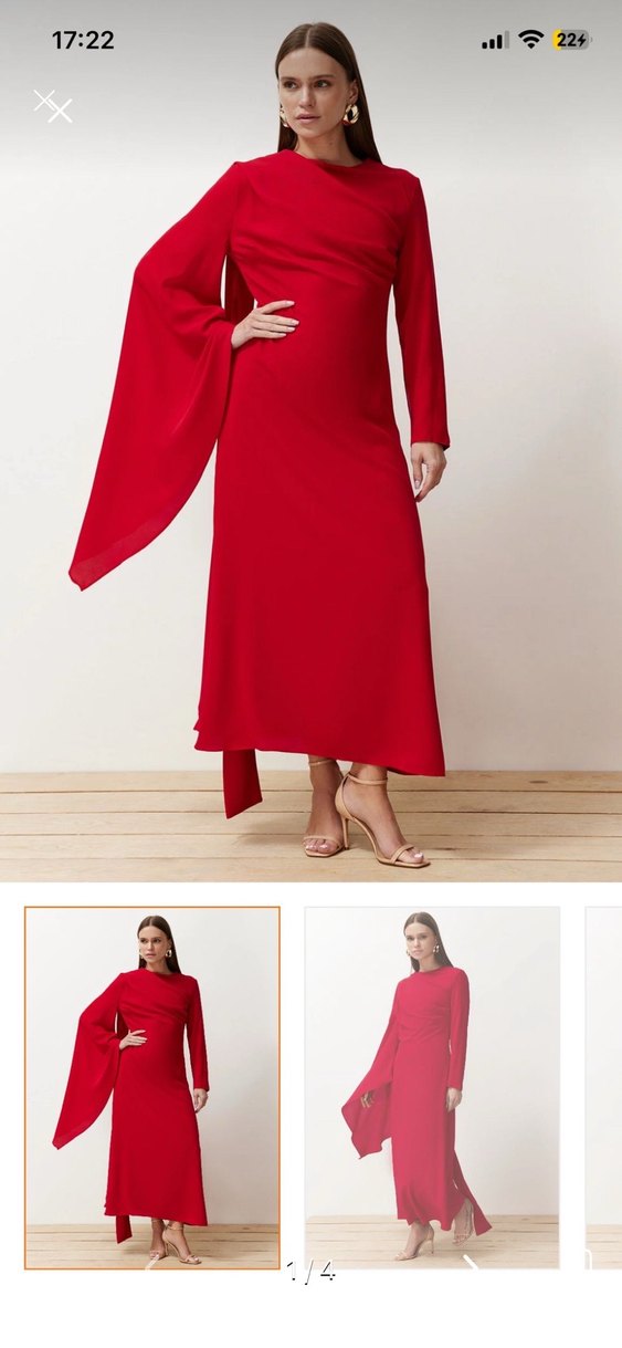 Kırmızı uzun elbise, tekne yaka ve püsküllü kollarla klasik ve minimalist görünüme sahip, ipeksi kumaştan ve rahat kesimlidir. Romantik akşamlar için uygundur. ❤️
