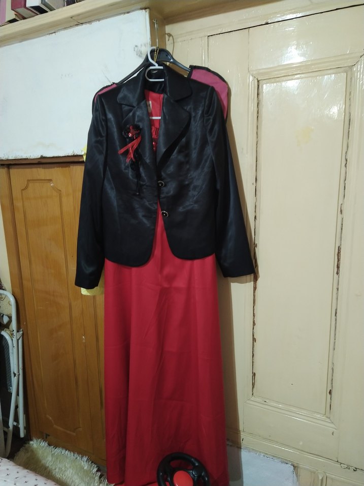 Kadınlar için uzun kırmızı saten elbise, siyah düğmeli, yakalı ceketle kombinlenmiştir. Gotik tarzda, ofis için uygun, uzun kollu ve regular fit.