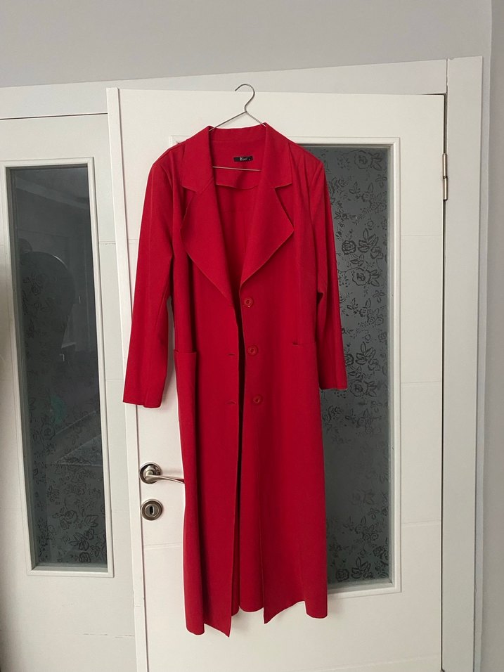 Kırmızı uzun kap, düğmeli ve kesimli yakası ile sade ve şık. Ofis için uygun, normcore tarzda ve rahat kesim.