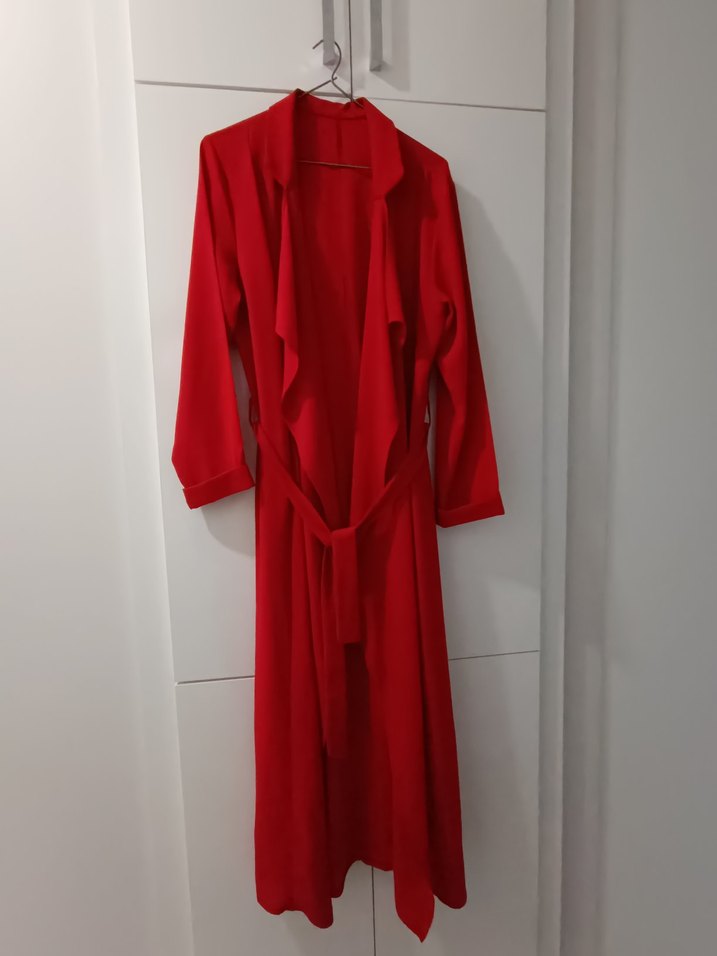 Uzun kırmızı, drapeli ve kesik yakasıyla, uzun kollu ve bol kesimli, minimalist sokak stili için uygundur.