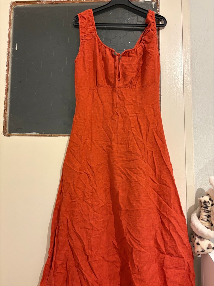 Kırmızı keten kumaştan, askısız yakalı, bol kesim ve drapeli detaylara sahip bohem tarzda uzun elbise.