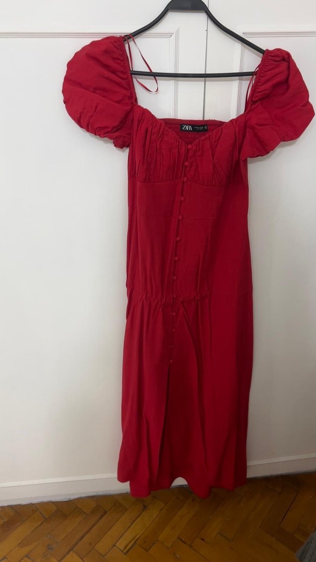 Bu uzun, koyu kırmızı keten elbise, düğmeli detaylar ve kısa kabarık kollar ile bol kesimdir. Straplez yakası ve vintage bohem tarzı romantik akşamlar için uygundur. ❤️
