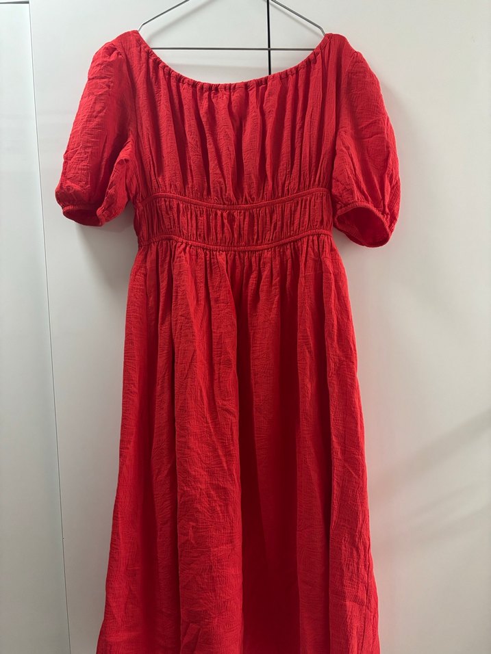 Keten kumaştan, bol kesim kırmızı elbise. Pliseli detaylara ve kayık yakaya sahip, kısa kolludur. Minimalist bohem tarzıyla günlük kullanıma uygundur. Markası UsPolo hiç giyilmedi etiketi üstünde 36 Beden