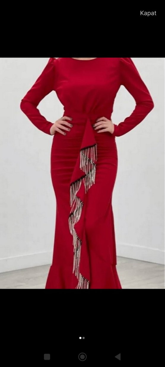 Uzun kollu, tekne yakalı kırmızı abiye elbise. Drapeli tasarım ve renkli batik desenlerle, düğün ve şık etkinlikler için uygun.Yaka kısmında çok az tiftik lenme var.