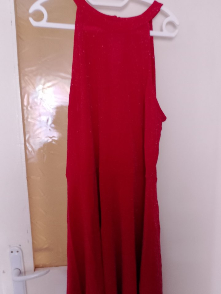 Kırmızı uzun abiye elbise, drapeli tasarımı, yüksek yakası ve kolsuz kesimiyle dikkat çeker. Gevşek kesim ve parlak, desensiz kumaşa sahiptir.