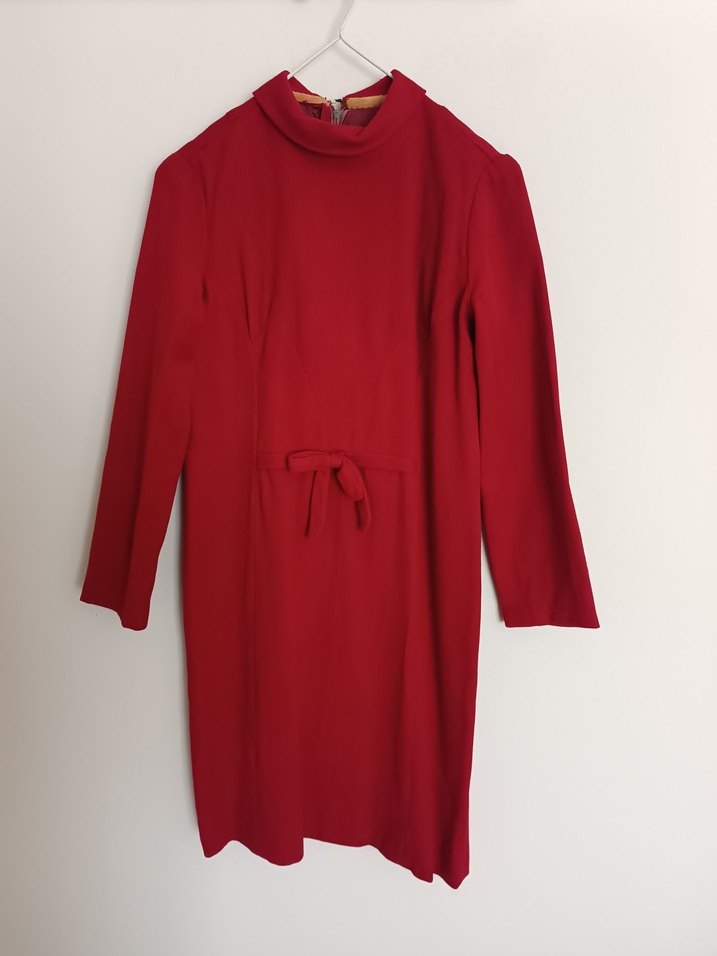 Annem'den kalma nostalji model. Kırmızı, uzun kollu, yüksek yakalı, midi uzunlukta, beli kurdelalı, yumuşak ve sıcak dokulu yün elbise. Ofis için uygun, sade ve şık.