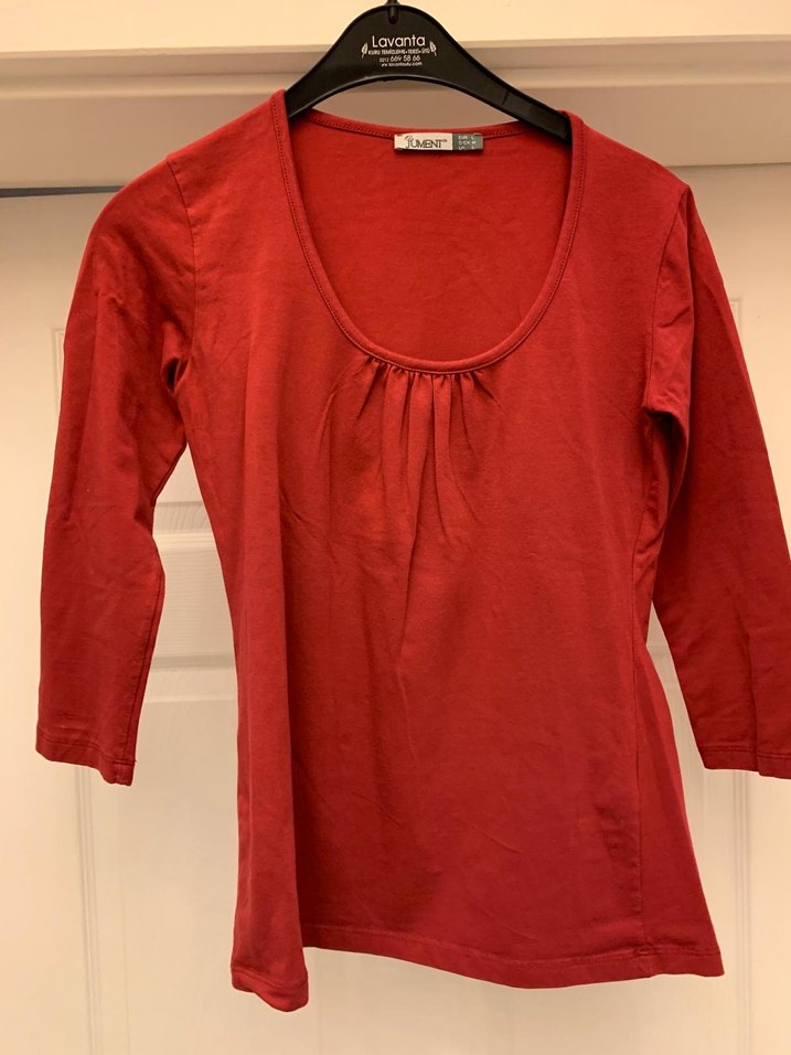 Kırmızı renkte, yuvarlak yakalı ve uzun kollu bluz. Yumuşak pamuk kumaştan, bol kesim ve parlak görünüme sahip, günlük kullanıma uygun.