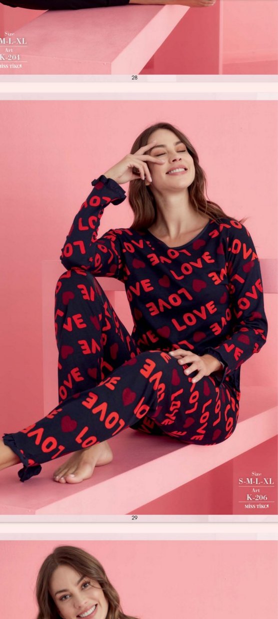 Kadınlar için bol kesim, uzun kollu ve uzun boylu, kırmızı ve koyu renk baskılı pijama takımı. 'LOVE' yazılı rahat kumaş, pop kültür tarzında. S-XL beden seçenekli.