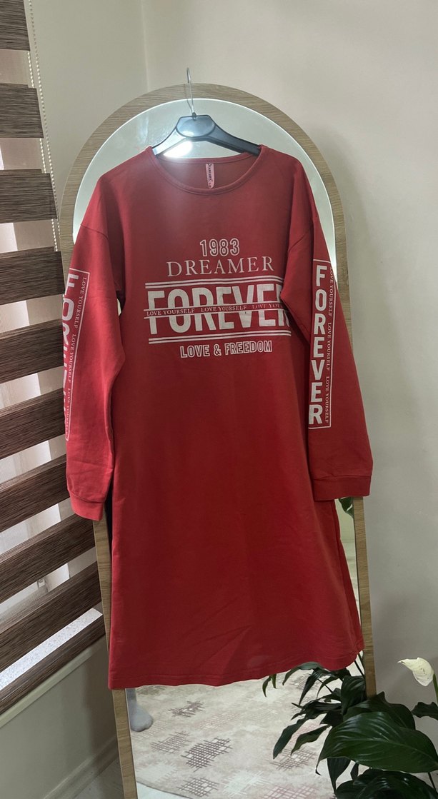 Kırmızı renkli, uzun kollu ve salaş kesime sahip kadın sweatshirt. Ön ve kollarda "DREAMER 1983" ve "FOREVER" baskıları bulunur. Yumuşak ve sıcak tutan kumaştandır. Uzun ve dökümlü tasarımla rahat bir tarz sunar.