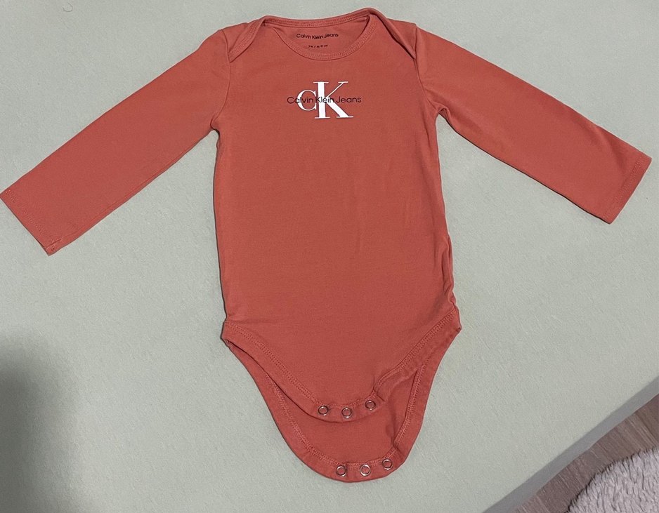 Koyu kırmızı, uzun kollu bebek body. Önünde baskılı Calvin Klein Jeans logosu ve düğmeli kapanış bulunur.