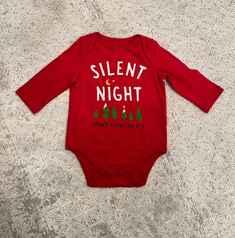 Kırmızı renkte, uzun kollu ve yuvarlak yakalı pamuklu bebek body. Örme dokusu ve "Silent Night" yazılı baskısı bulunur. Sokak stili için uygundur.