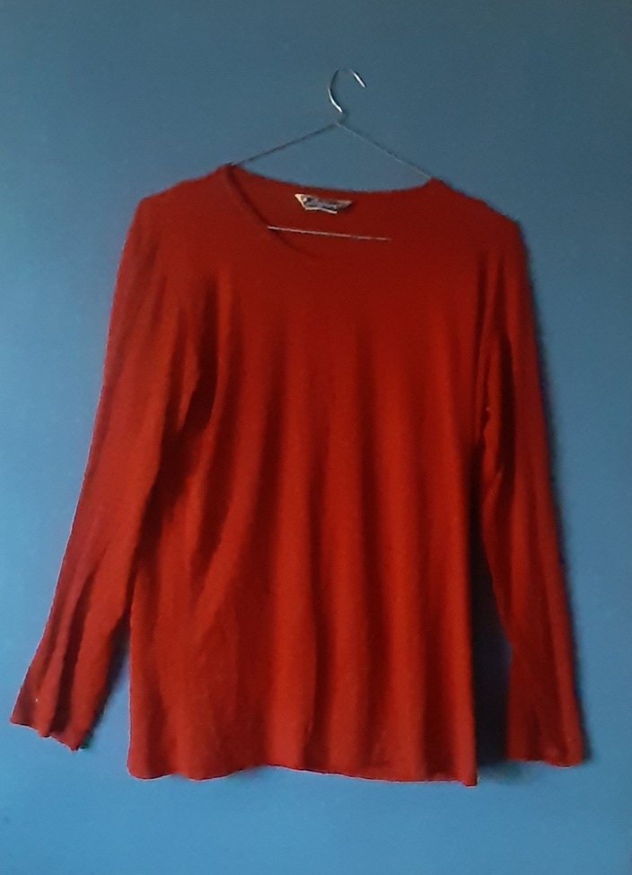 Kırmızı, uzun kollu ve yuvarlak yakalı buluz. Rahat ve hafif keten kumaştan, salaş kesimli, günlük kullanıma uygun sade ve şık model.