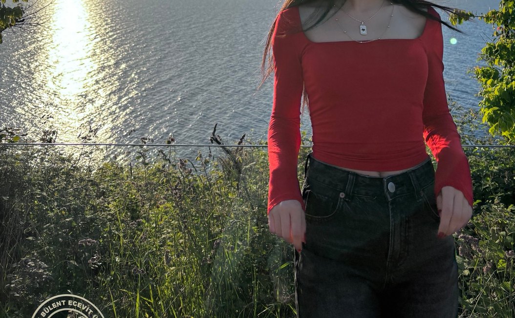 Koyu denim kumaştan, uzun kollu ve yüksek yakalı, fitted kesim kırmızı . Midi boyda ve yırtmaç detaylı, rahat sokak stili için uygun, desensiz tasarım crop