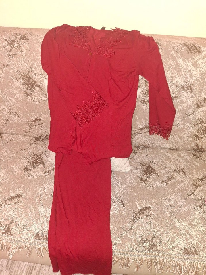 Uzun kollu ve uzun boylu, kırmızı renkte, dantel detaylı bohem tarzda kadın pijama takımı. Rahat ve şık uyku keyfi için idealdir.