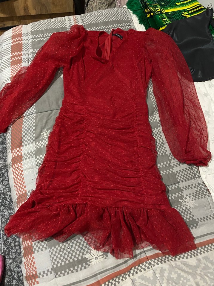 Uzun kollu, V yakalı, kırmızı bohem midi elbise, fit kesim ve fırfır detaylarıyla vintage parti tarzına uygundur.