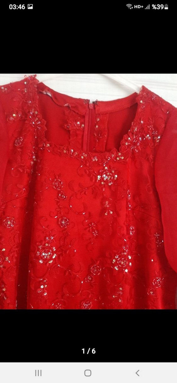 Kırmızı, uzun kollu, tekne yaka ve işlemeli boncuk detaylara sahip klasik kesim abiye elbise, düğünler için uygun. ✨