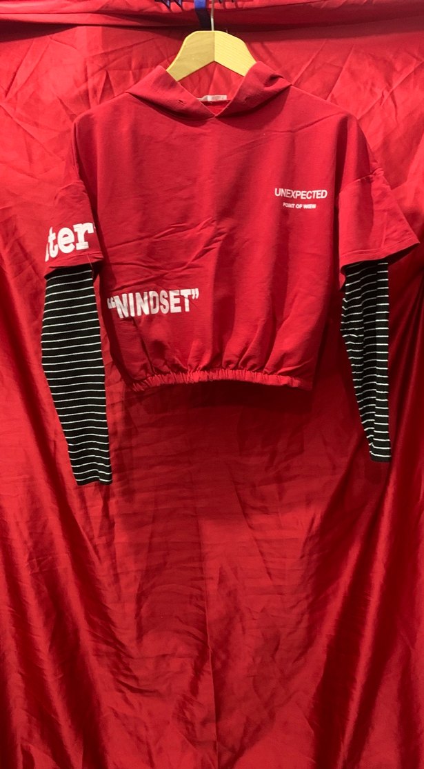 Kırmızı, uzun kollu, siyah beyaz çizgili iç kollu, bisiklet yaka ve bol kesim kısa boy crop sweatshirt. "UNEXPECTED" ve "NINDSET" yazılı, sentetik kumaştan sportif rahat stil.