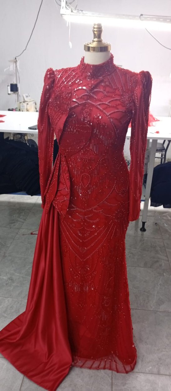 Bu kırmızı, uzun kollu, v yaka ve drapeli abiye elbise, desenli detayları ve dar kesimiyle düğün için uygun. ✨