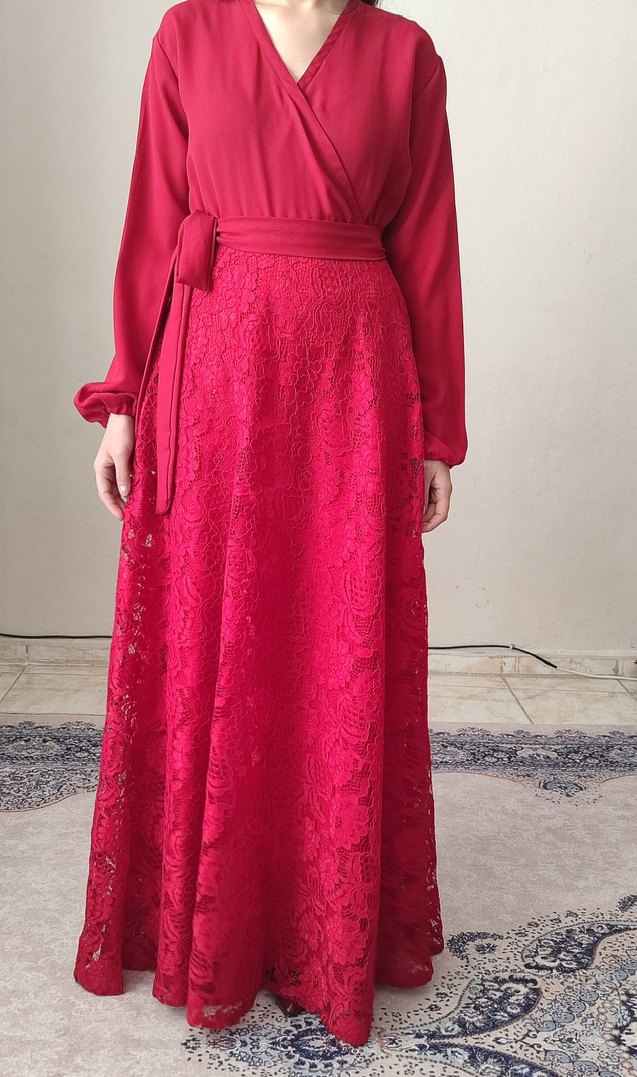 Parlak kırmızı renkte, uzun kollu ve yüksek yakalı, bol kesim drapeli uzun elbise. Dantel etek detayıyla düğünler için uygundur.