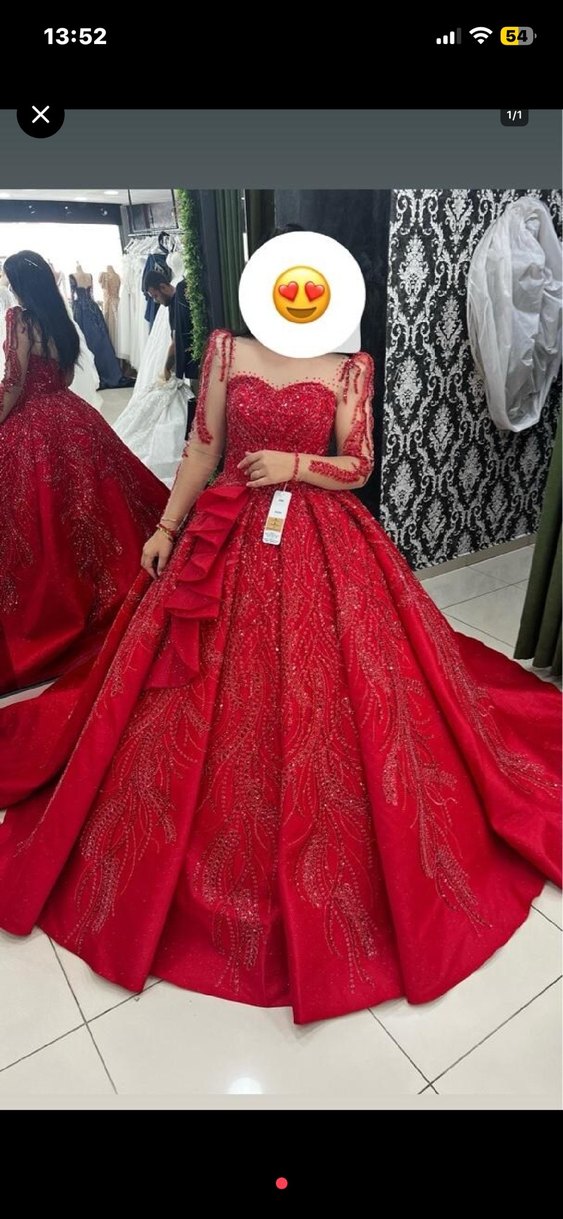 Kırmızı, straplez yaka ve uzun kollu, drapeli ve desenli, parlak kumaştan yapılmış klasik ve şık uzun abiye elbise.