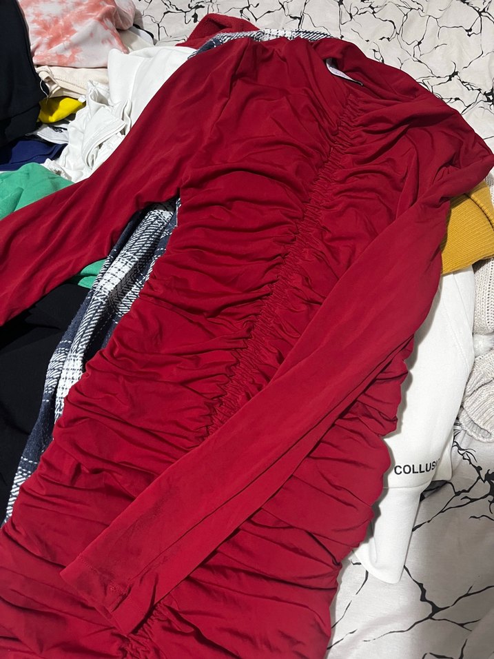 Kırmızı renkte, yüksek yakalı ve uzun kollu, drapeli desenli fitted kadın triko elbise. Sentetik kumaştan, streetwear ve athleisure tarzına uygun.