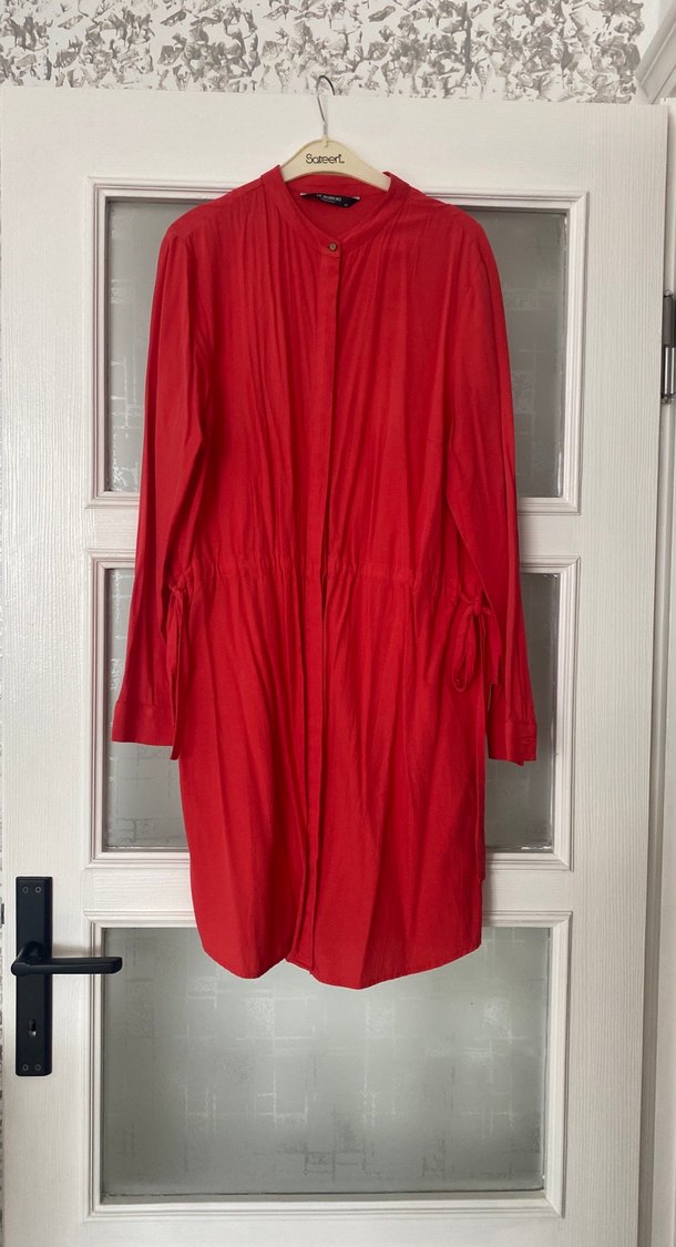 Kırmızı keten tunik, yüksek yakalı, uzun kollu ve drapeli detaylıdır. Uzun boyu ve minimalist tasarımı ile ofis için uygundur.