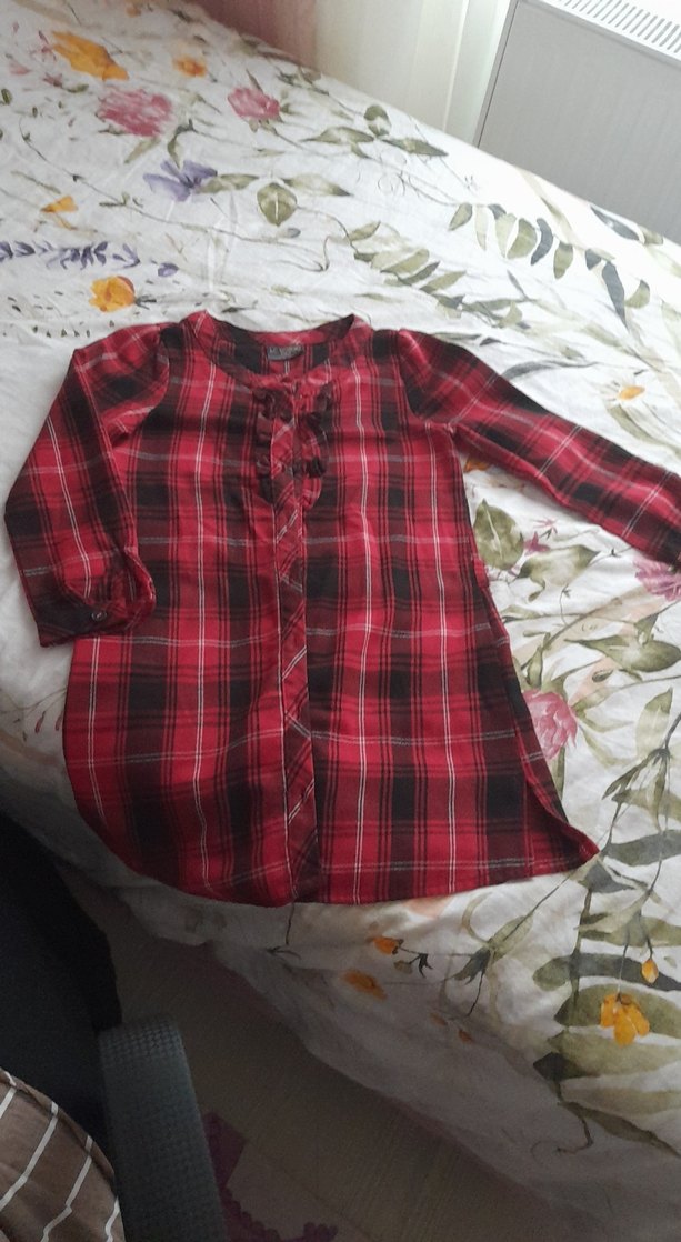 Kadın gömleği, bol kesim, uzun kollu ve V yaka tasarıma sahiptir. Düğmeli ön kısmı ve koyu kırmızı batik deseniyle rahat, bohem bir stile sahiptir. kız çocuk için 6 7 yaş yazıyo boy 60 cm kol altı arası 34 cm dir