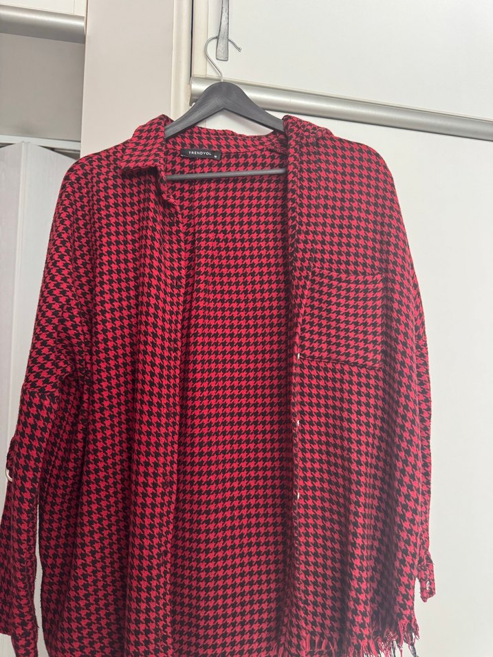 Kadınlar için uzun kollu, düğmeli, kırmızı koyu tonlarda kazayağı desenli, midi boy, bol kesim tekstil gömlek. Günlük rahat kullanım için uygundur.