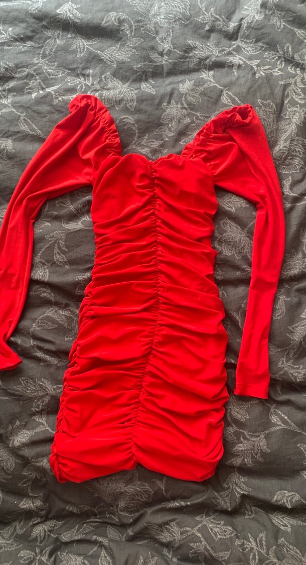 Bu kırmızı, vücuda oturan mini elbise uzun kollu ve fırfırlı detaylara sahip, önü kare model 45-50 kilo arası olur