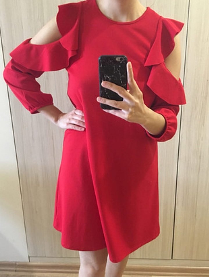 Kırmızı uzun kollu, fırfırlı detaylı ve bol kesim elbise. Yumuşak ve sıcak Romantik akşamlar için uygundur.