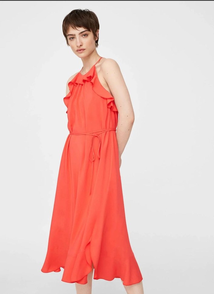 Yüksek yakalı, fırfırlı detaylara sahip uzun, kolsuz elbise. İpeksi kumaştan, salaş kesim ve parlak kırmızı renkte. Romantik akşamlar için uygun.