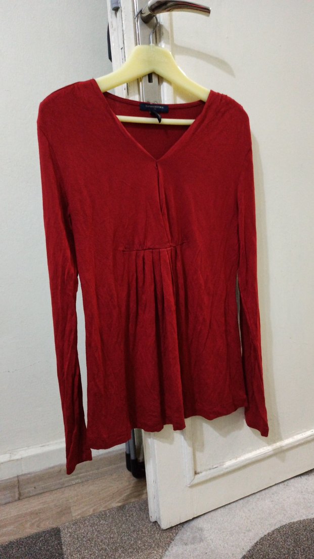 Kırmızı, V yakalı, pile detaylı uzun kollu hamile bluzu. Yumuşak keten kumaştan, bol kesim ve normal midi boyda, günlük kullanım için uygundur.
