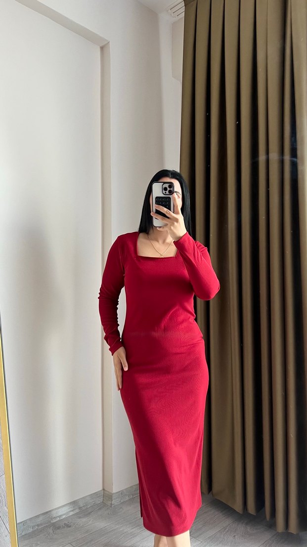 Kırmızı uzun kollu, kare yakalı, ince kesim kadın elbisesi. İpeksi kumaştan, minimalist ve şık tasarım, günlük kullanım için uygundur. Yeni hiç kullanılmadı