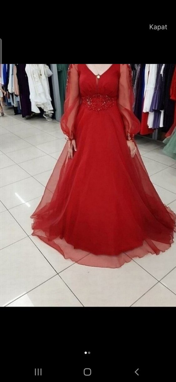 Kırmızı uzun kollu abiye elbise, V yakalı ve işlemeli detaylara sahip. Drapeli ve klasik şıklığı yansıtan tasarım.