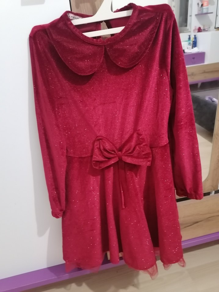 Kırmızı renkli, uzun kollu, yakalı ve parlak kumaştan kız elbisesi. Bol kesim ve belde fiyonk detayıyla klasik gotik tarzı yansıtıyor. Günlük dışında çok özel günlerde bile çok şık