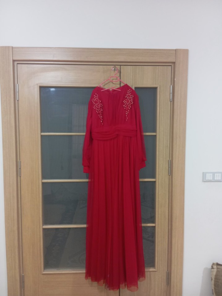 Kırmızı Uzun Kollu Kadın Abiye Elbise