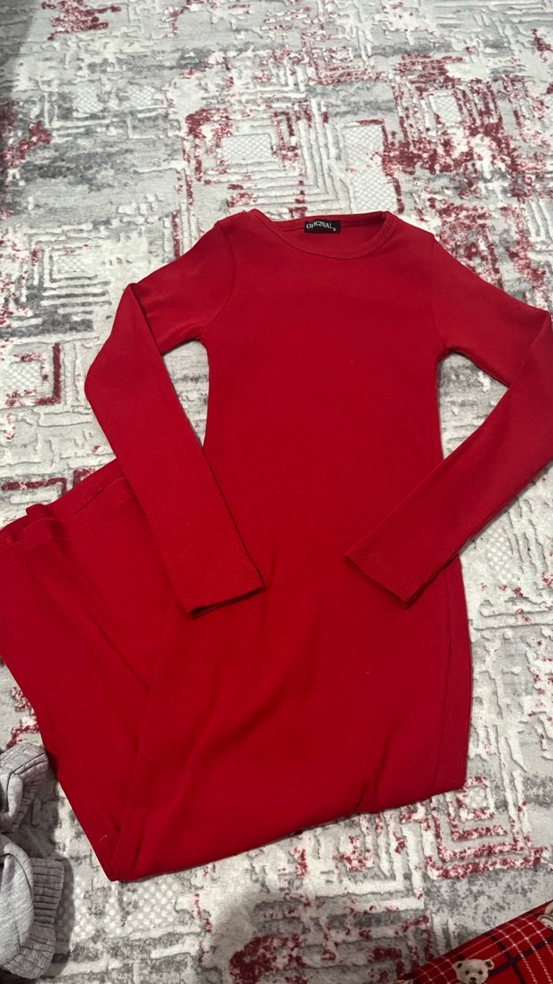 Bu kırmızı, uzun ve dar kesim elbise uzun kollu ve yuvarlak yakalıdır. Pürüzsüz sentetik kumaştan üretilmiş, sade ve deseniz tasarımıyla rahat ve şık bir sokak stili sunar.