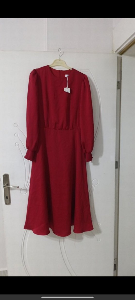 Kırmızı renkli, uzun kollu, salaş kesim kadın elbisesi. İpek gibi kumaştan, drapeli ve yuvarlak yakalı, modern klasik tarzda günlük kullanıma uygun minimal tasarım.