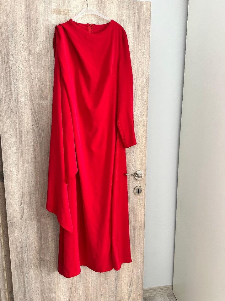 Kırmızı renkte, detaylı uzun kollu, , bol kesim kadın elbisesi. Yumuşak sentetik kumaştan üretilmiştir ve modern klasik tarzda minimal bir görünüm sunar. 44 bedendir sadece iki kez giyildi şalı da dahildir