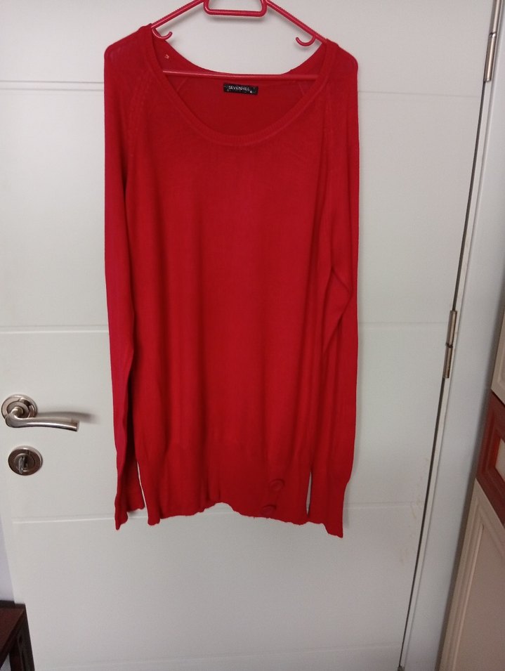 Kırmızı, uzun kollu, yuvarlak yakalı yapılmış, kadın kazağıdır. Normal midi boyunda, desensiz ve minimalist tarzda, gündelik kullanım için uygundur. bir kaç kez giyildi bir yerinde hafif tüylenme var.gogus 50 cm, boy 74 cm , kol 66 cm . yünlü yumuşak bir dokusu vardır