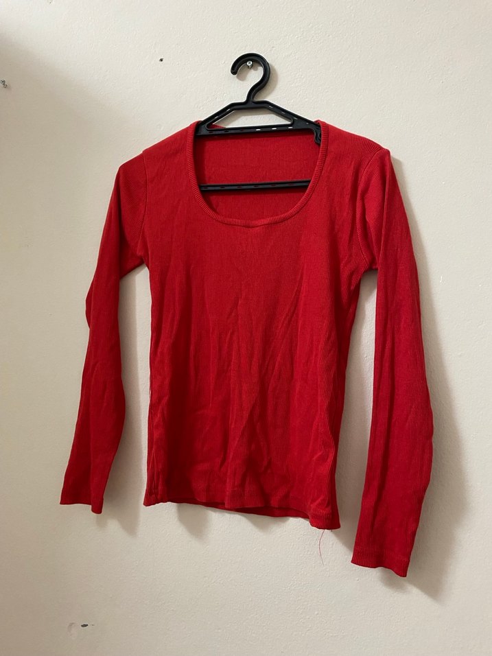 Koyu kırmızı renkte, uzun kollu ve yuvarlak yakalı keten kumaştan yapılmış, sade ve dar kesim kadın bluzu. Günlük kullanıma uygundur.