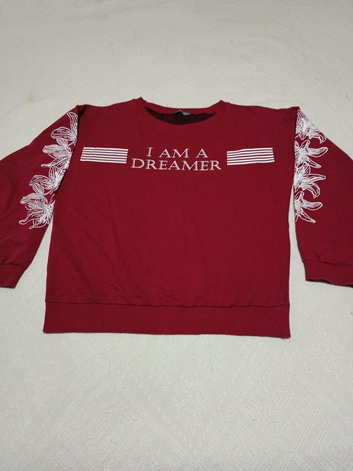 Kırmızı renkli, uzun kollu, beyaz baskılı detaylara sahip kadın sweatshirtü. Örme sentetik kumaştan, normal boy ve bol kesim. Önünde 'I AM A DREAMER' yazısı bulunur.