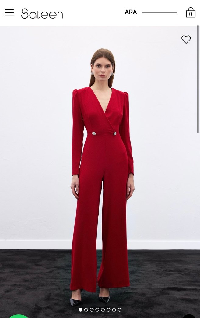 Parlak kırmızı tulum, V yakalı ve düğmeli uzun kollu tasarımıyla şık ve çağdaş bir görünüm sunar.