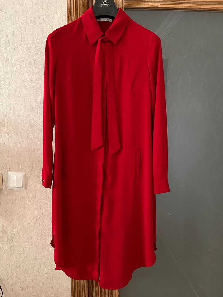 Kırmızı uzun kollu kadın tunik, yakalı ve dökümlü tasarıma sahip. İpeksi kumaştan yapılmış, rahat kesimiyle ofis için uygundur. Minimalist ve sade stil sunar.