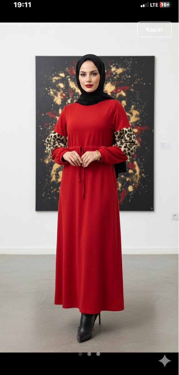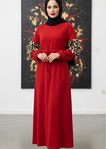 Kollarında leopar kürk detaylı, bol kesim, yuvarlak yakalı kırmızı uzun elbise. Yumuşak sentetik kumaştan, gündelik kullanıma uygun, rahat ve sade tarzda.