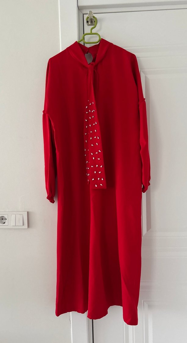 Kırmızı, uzun kollu, salaş kesim kadın elbise. İpek gibi parlak kumaştan, drapeli ve halter yakalıdır. Günlük kullanıma uygundur.