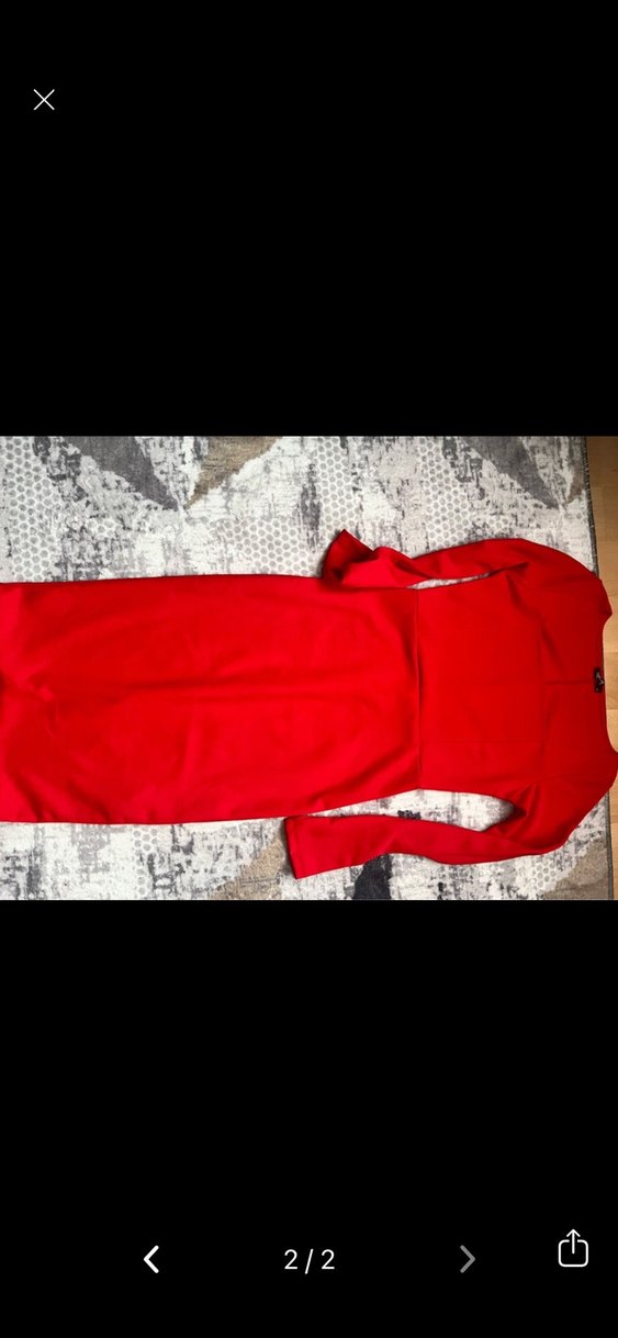 Kemer detaylı, uzun kollu ve yüksek yakalı, kırmızı uzun elbise. Düz ve şık, sentetik kumaştan, minimalist ve sokak modasına uygun.