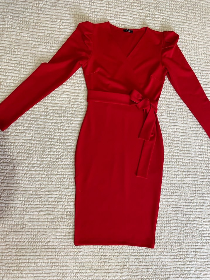 Kırmızı, uzun kollu ve kemerli bel detayıyla klasik modern bir kalem elbise. V yaka ve parlak kumaşıyla ofis için uygundur. ✨