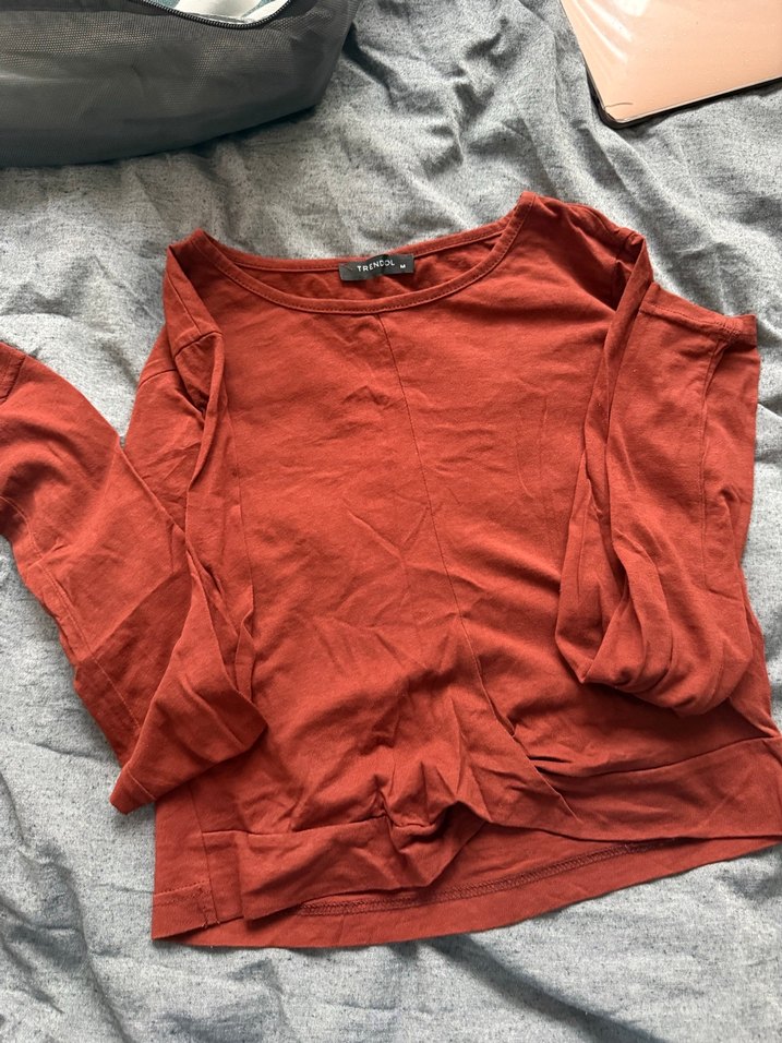 Kırmızı Uzun Kollu Keten Kadın Tişört